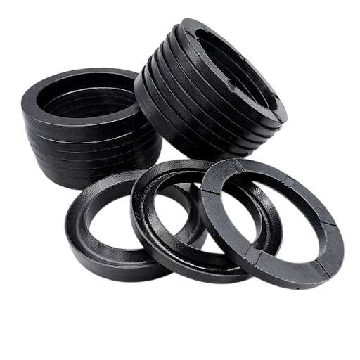 Graphite compressed and molded into ring shape for high-pressure and high-temperature sealing.